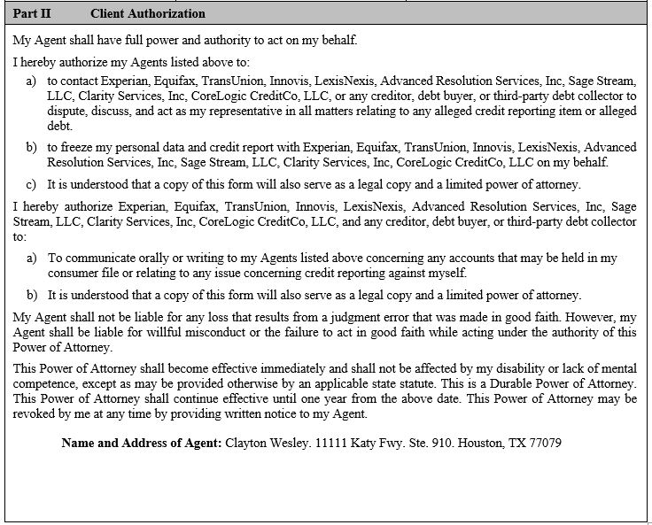 The Credit Agents will need permission from you to communicate with the credit bureaus and possibly creditors and others, in your name and on your behalf, including writing and transmitting letters and documents in your name. This is a Limited Power of Attorney, granting permission to T.C.A. to do this. It authorizes and directs T.C.A. to act as your disclosed and undisclosed agent when performing the services you have retained T.C.A. to provide. You can cancel your authorization, and the Limited Power of Attorney, at any time by sending T.C.A. a written and signed letter stating that you retract your authorization. Without this authorization and Limited Power of Attorney, T.C.A. is unable to represent you, and canceling it will prevent T.C.A. from performing its duties. Please make a copy of this Agreement for your records. KNOW BY ALL, I/We, the undersigned and Principal(s), have the right and hereby make, constitute and appoint T.C.A. (Herein referred to as “Agent”) as my/our true and lawful Agents. Giving unto said Agent, the full power to do and perform all and every act that I/we may legally do, and every power necessary or convenient to carry out the specific purposes for which this power is granted and I/we hereby ratify all lawful acts of my/our Agent. Specific Purpose: To proactively dispute and verify any erroneous and inaccurate information in regards to my/our credit report(s) or with any company/person furnishing information to the credit repositories, and to perform any lawful act necessary to conduct such an investigation and remove any inaccurate, non-current, invalidated, unverifiable information and referral to an account negotiation service. The undersigned’s Agent is authorized to furnish a copy of this Agent Representation to credit bureaus, creditors, collection agencies, or others associated with the Client’s accounts. The undersigned’s Agent may designate one or more employees, agents, or third parties to assist in these services. The recipient of an original, photocopy, e-mail or facsimile of this document is specifically instructed by the undersigned to communicate with the designated Agent. This AGENT REPRESENTATION is effective upon signing by the principals and specifically authorizes the recipient to discuss, disclose and convey documents, and otherwise provide information to the described AGENT in the same manner recipient would otherwise provide and disclose to the undersigned principals. This AGENT REPRESENTATION authorizes my Agent to draft letters on my behalf; obtain, review and discuss my consumer credit report; bank and creditor account information; medical bills and condition; employment status; financial information (whether public or non-public), and any other personal information about me that is necessary or convenient to resolve the designated matters.