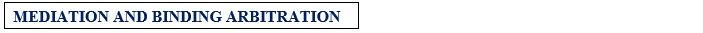 Client and T.C.A. agree that any dispute (contract, warranty, tort, statutory or otherwise), including but not limited to: (a) Disputes or claims arising from or related to this Agreement and any amendment hereto; (b) Disputes or claims arising from a representation, omission, promise or warranty allegedly made by or on behalf of T.C.A.; and (c) Disputes or claims arising from or related to the Credit Repair Organizations Act (or other applicable federal, state or local law, statute or ordinance), shall first be submitted to mediation and, if not settled via mediation, shall thereafter be submitted to binding arbitration (using a single arbitrator) pursuant to the Federal Arbitration Act or, if applicable, similar state statute, and not by or in a court of law. All deci¬sions respecting dispute arbitrarily shall be decided by the arbitrator. The arbitrator shall issue a binding written decision resolving all issues of law and fact. The arbitrator may award the prevailing party, if any, as determined by the arbitrator, all or any portion of its costs and fees. “Costs and fees” may include rea¬sonable expenses, including mediator / arbitrator fees, administrative fees, travel expenses, out of-pocket expenses, witness fees and reasonable attorney’s fees. Arbitration shall take place pursuant to the Amer¬ican Arbitration Association Commercial Arbitration Rules. If any conflict exists between this Agreement and such procedures, the provisions of this Agreement shall control. If the parties cannot agree upon a mediator and/or arbitrator, either party may petition a court of general jurisdiction in Harris County, Texas to appoint a mediator and or arbitrator. Such action shall not constitute waiver of the right to enforce bind¬ing arbitration. The parties agree that notwithstanding anything to the contrary, the rights and obligations in this mediation-arbitration provision shall survive (1) termination of this Agreement by either party; or (2) default of this Agreement by either party. Given that this Agreement provides for mandatory mediation and arbitration, if any party commences litigation in violation of this provision, such party shall reimburse the other parties to the litigation for the costs and expenses, including attorneys’ fees, incurred in seeking to abate such litigation and compel arbitration. (d) Either party may bring claims against the other only in his/her or its individual capacity and not as a plaintiff or class member in any purported class or representative proceeding.