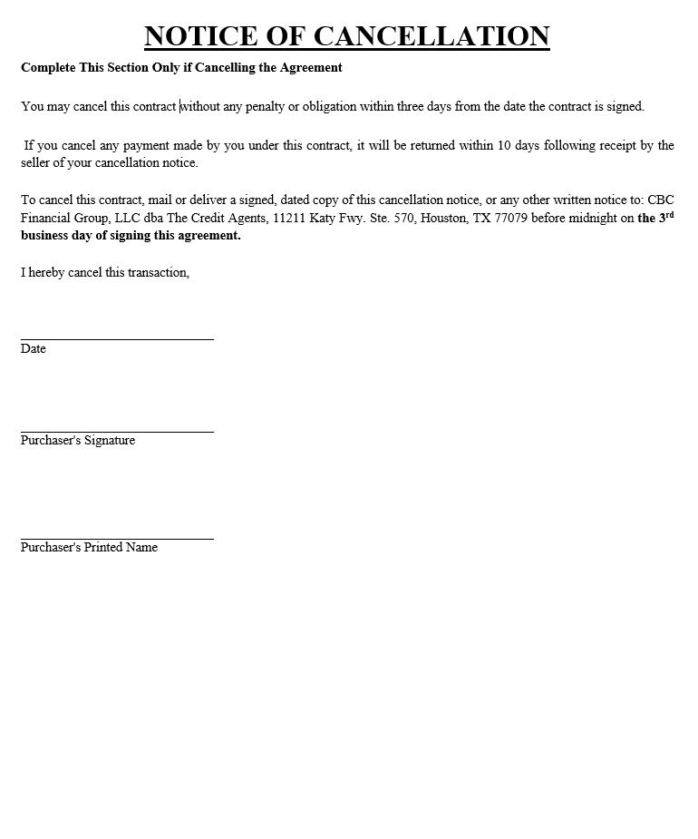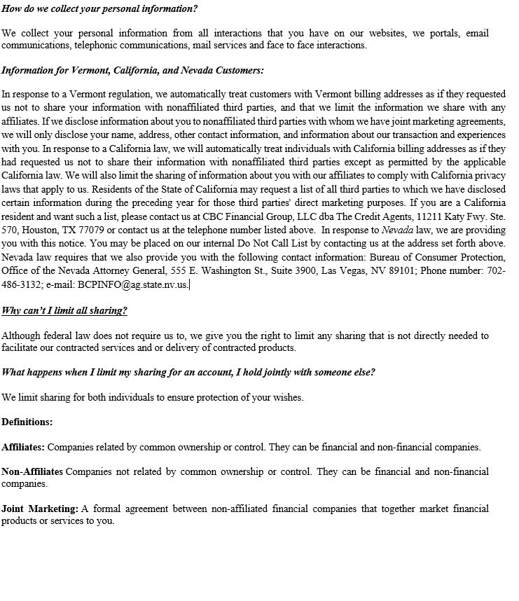 Client listed on this agreement (hereinafter “Client”) engages and retains CBC Financial Group, LLC dba The Credit Agents, (hereinafter “T.C.A.”) with a principle address of 11211 Katy Fwy. Ste. 570, Houston, TX 77079 for the purpose of credit report analysis, document review and audit and verification services to the three major credit bureaus: Equifax, Experian and Trans-Union; under the following terms and conditions: T.C.A. will help Client obtain credit reports. Once received, T.C.A. will analyze Clients credit reports to identify any items the Client believes may be inaccurately appearing on any of their credit reports. T.C.A. will use written materials and industry knowledge to persistently challenge any inaccurate credit items that Cli¬ent identifies as inaccurate or erroneous by drafting and sending targeted disputes and/ or interventions to the three major credit bureaus and/or creditors on Client’s behalf and in Client’s name on a regular basis while enrolled. Under the Fair Credit Reporting Act (15 U.S. Code § 1681(a) - 1681(t)) the Credit Reporting Agencies are required to open a dispute, notify the data furnisher of the dispute, and complete the investigation within thirty (30) days. Client will receive three individual updated credit reports by mail approxi¬mately every 30-45 days. In order for T.C.A. to track progress of investigation results, Client must keep an active and approved credit monitoring website service. When T.C.A. receives the investigation results from Client’s credit monitoring website account, T.C.A. will carefully review them and determine what will be challenged next and on what basis. This process is repeated until all of the inaccurate or erroneous information has been corrected or verified as accurate by a creditor or credit bureau, or until Client cancels, whichever comes sooner.