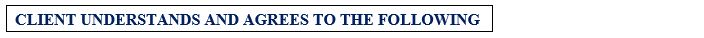 In order for T.C.A.’s services to be effective, it is critical that this entire agreement and each of the following line items is fully understood and agreed to. Failure to read, acknowledge and agree to the terms set below can have a negative impact on benefits and outcome of our services. Should a dispute or com¬plaint arise during or after the completion of the program, we will provide you with a copy of this legally signed agreement. I acknowledge and agree to the following: